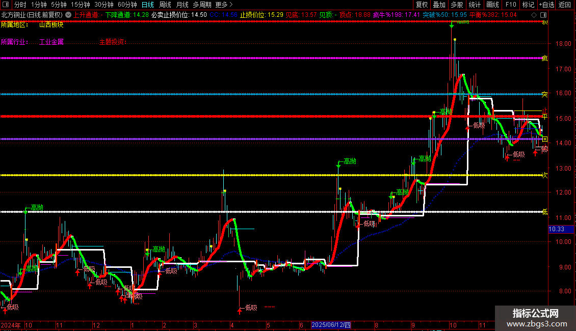 下降通道:IF(VAR11<REF(VAR11,1),VAR11,DRAWNULL),LINETHICK4,COLORGREEN;