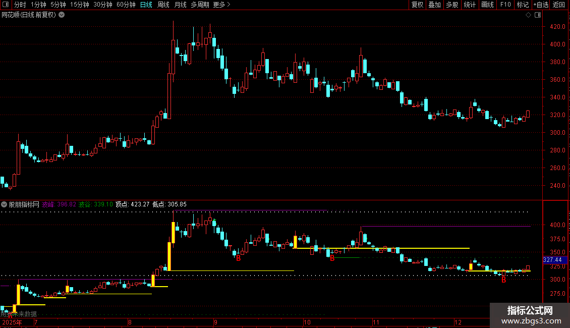 波峰: REF(H,BARSLAST(HD)),POINTDOT,COLOR990099;