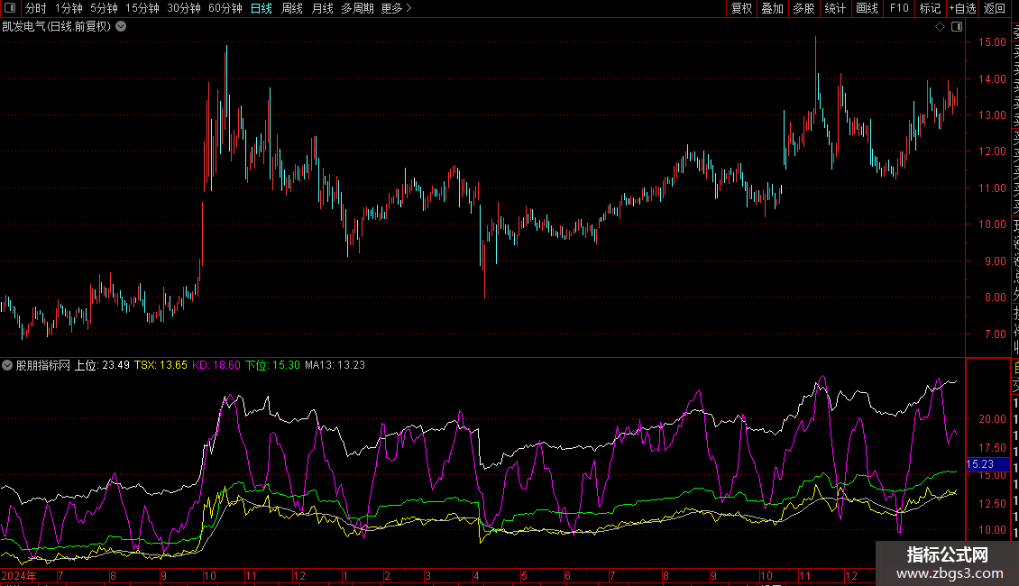 `TSX`(即 `X1`)为核心动态线,结合 `KD` 线、`MA13` 判断趋势方向与强度。