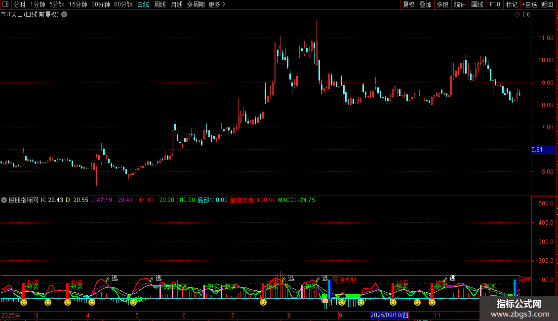 DRAWTEXT((CROSS(J,0) AND (VAR6 <= (0 - 7))),100,'--导弹发射'),COLOR0000FF;