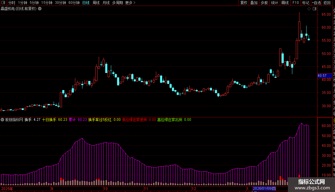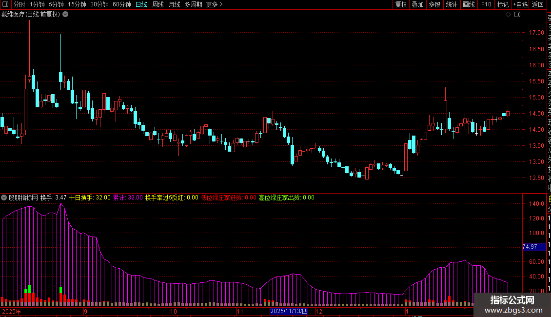 3. 柱状图(灰色):以灰色柱状图绘制每日换手率,柱体从0轴开始。