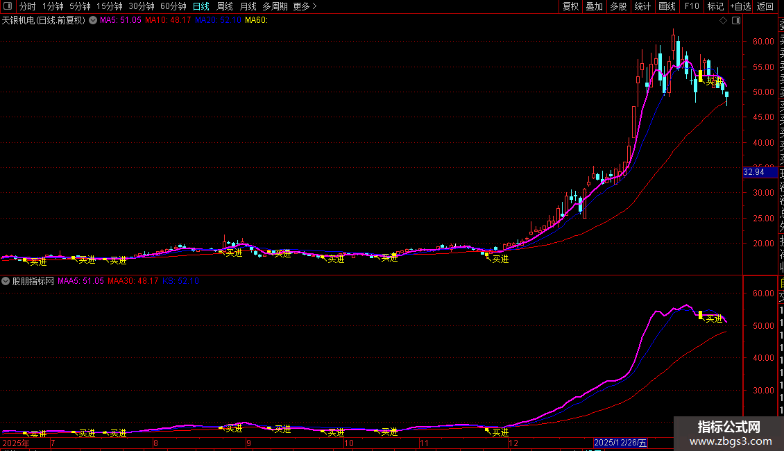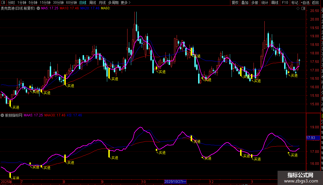 蓝色线 (KS): 这是一条动态支撑线。它的规则是:比较10日均线和30日均线,始终显示数值较大的那一条。因此,这条蓝线代表了当前更重要的一个中期支撑或压力位。当股价在其上方时,它通常是支撑;在下方时,则是压力。