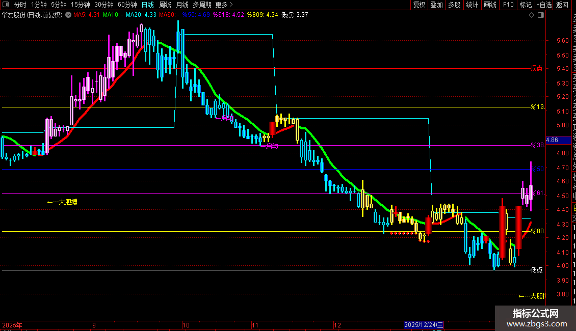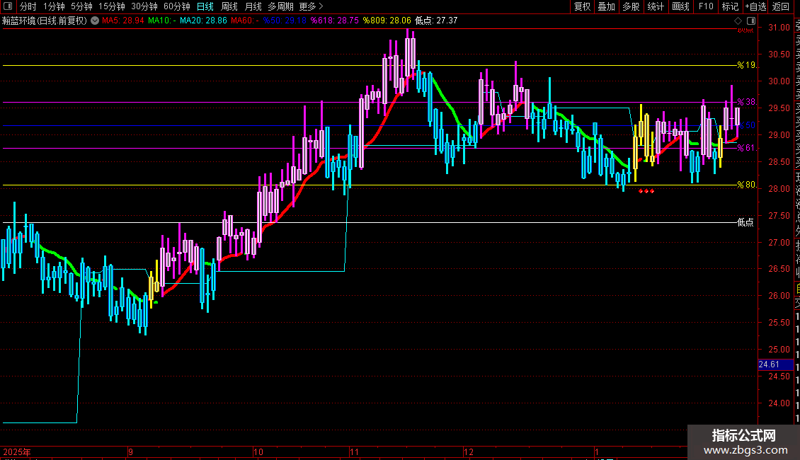 计算最近N(默认80)个周期内的最高价(高)与最低价(低),并以此区间为基准,绘制出19.1%、38.2%、50%、61.8%、80.9% 五条斐波那契回调线,连同“顶点”(区间高点)和“低点”(区间低点)一起,作为重要的支撑阻力位参考。这些水平线在图上以不同颜色标注。