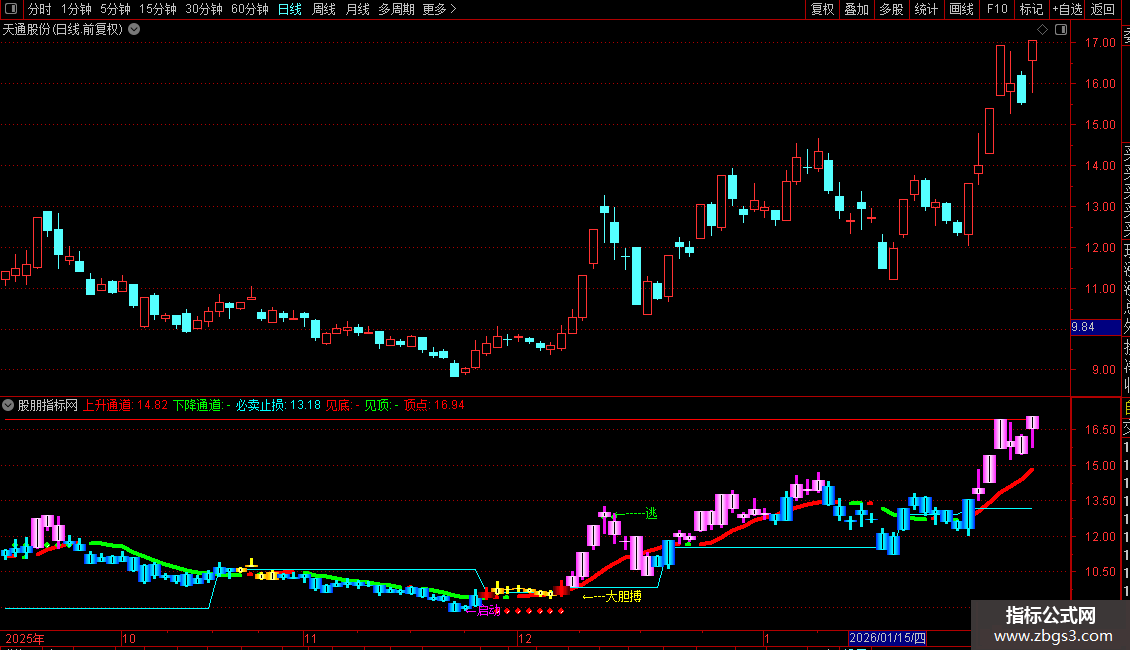 上升通道:以9日均线为基础,当该均线向上时,用红色粗线绘制,代表短期上升趋势。