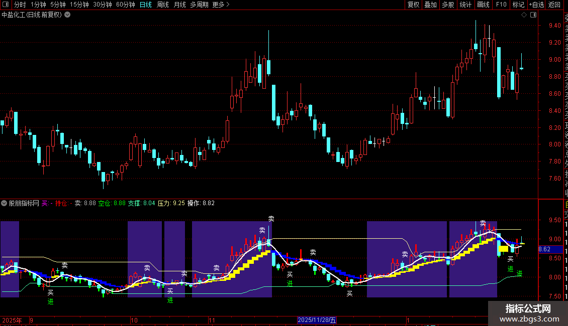 买点 (`买`):当`指导线`上穿`界`,或`买线`上穿`卖线`时,在收盘价位置标记洋红色信号。这通常作为开仓或加仓的参考点。