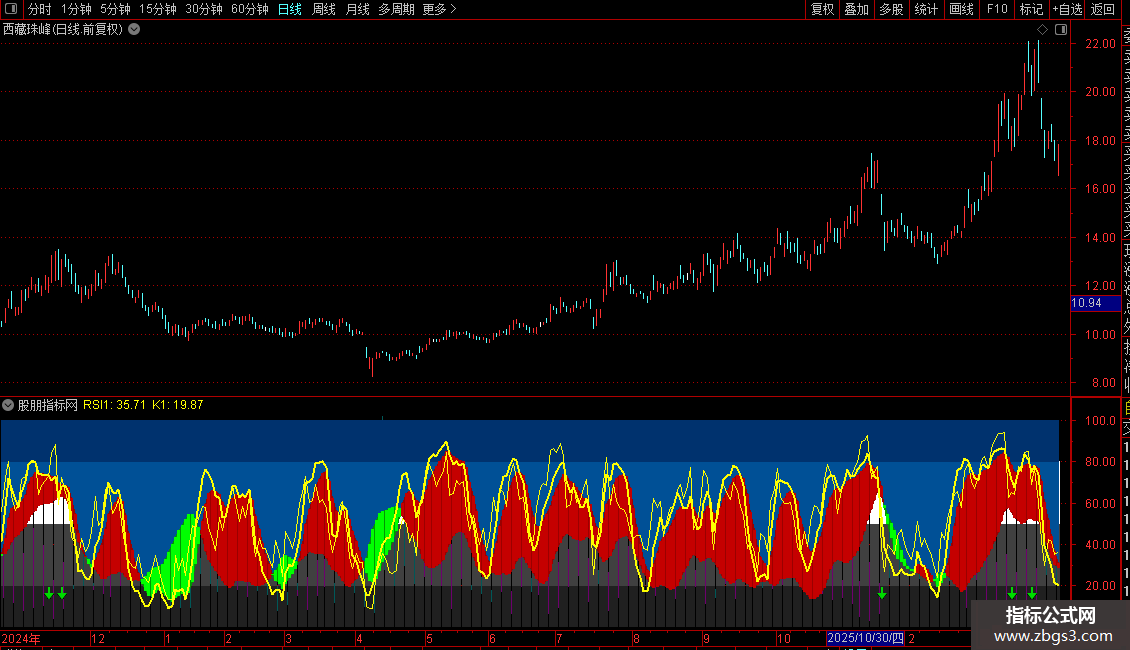 D < ADXR(绿色柱):当`D`值低于`ADXR`时,显示为绿色柱。这表示价格动能(`D`值代表的超买超卖状态)弱于趋势强度,可能预示趋势动能减弱或进入调整。