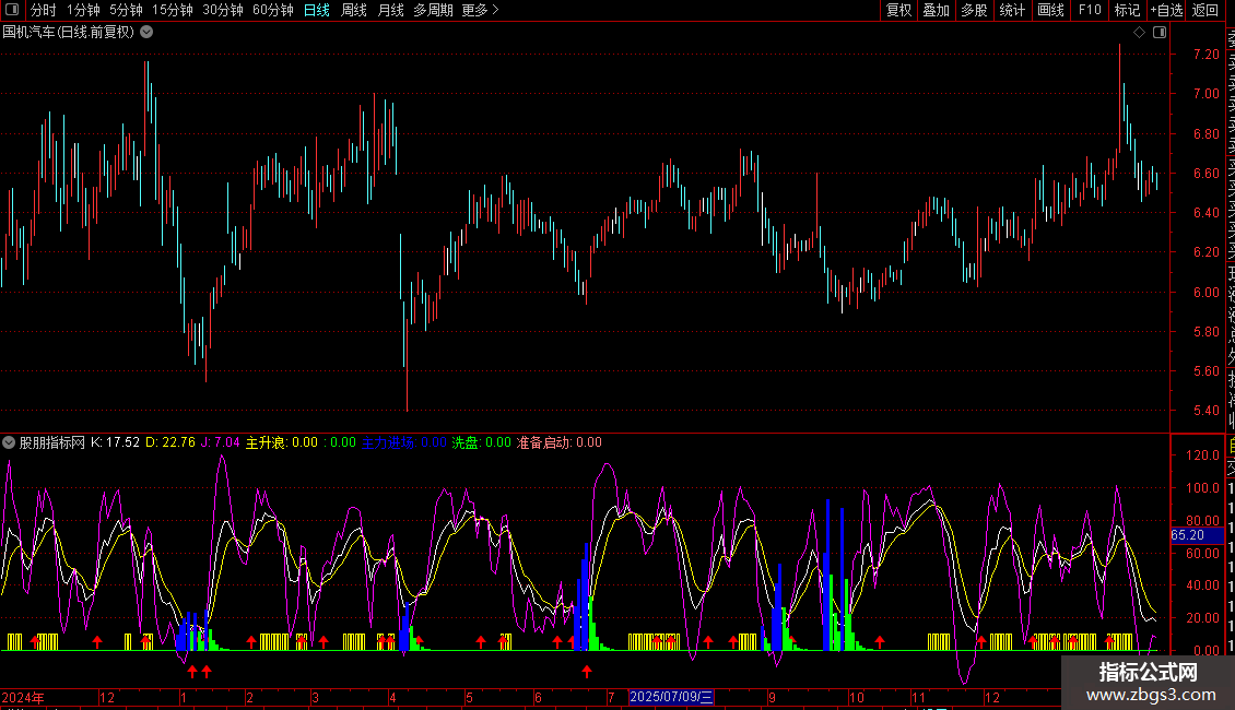 买入信号:当K线向上穿越D线,且J线也同时向上穿越D线时,在副图顶部(数值10附近)显示一个向上的箭头图标。