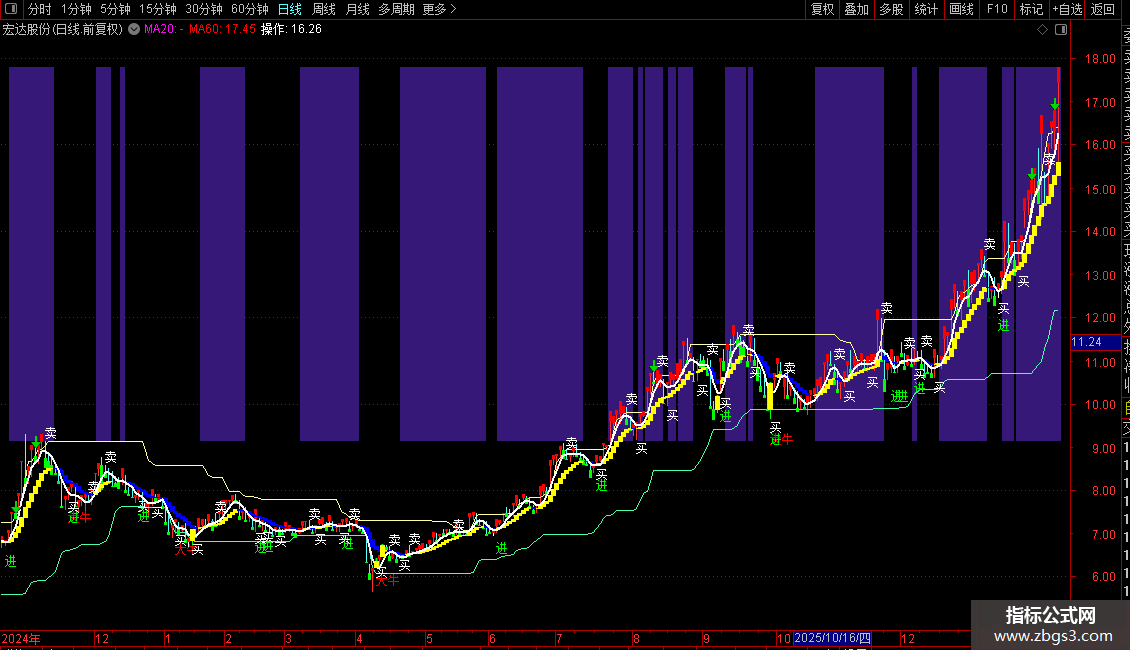 趋势背景:当买线上穿或位于卖线之上时,在最近130日的高低点区间内绘制深红色背景,表示“持仓”或上升趋势区域。反之无背景色,表示“空仓”或下降趋势区域。K线会叠加在此背景上显示。