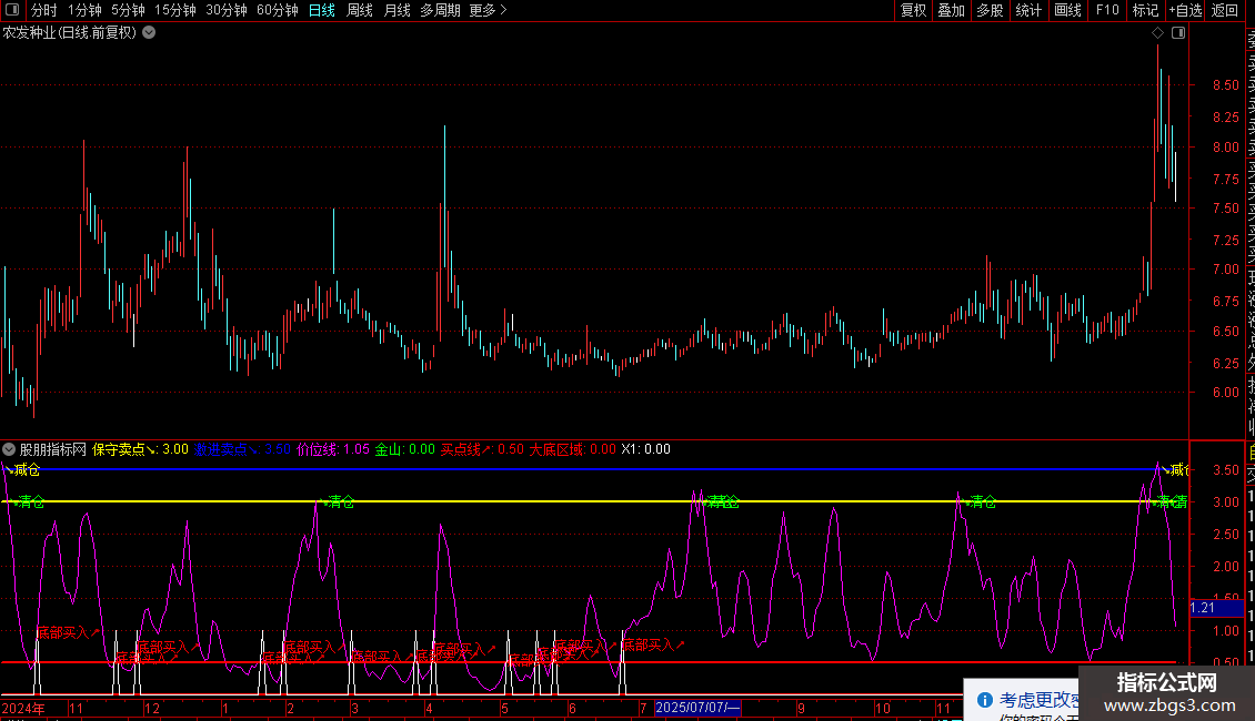 保守卖点↘ (3.00): 一条黄色的水平参考线。当“价位线”自上向下跌破此线时,指标会标记“↘清仓”文字,提示更强的卖出或清仓信号。