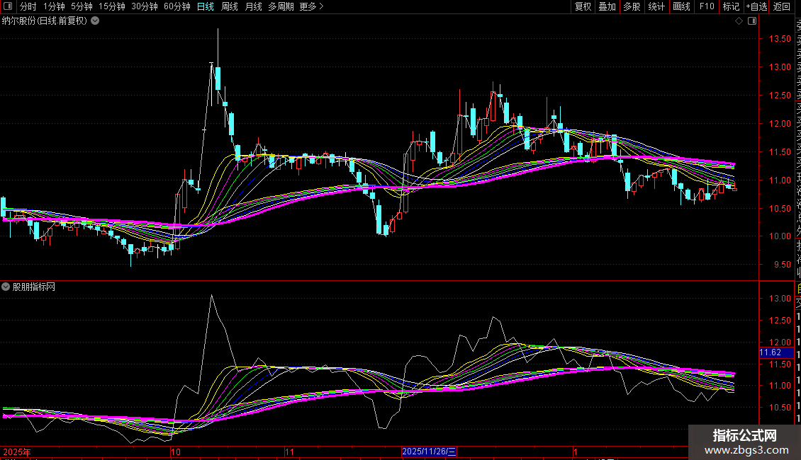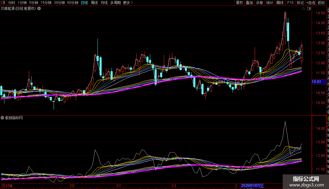 NOTEXT14(EMA60的13周期均线)为品红色粗线。