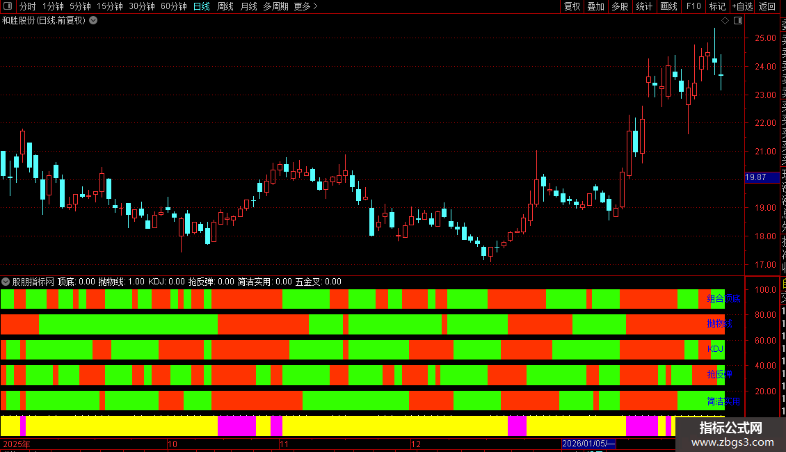 当 上方五个信号(顶底、抛物线、KDJ、抢反弹、简洁实用)的输出条件同时为“真”(即均发出看多信号)时,该区域显示 COLORFF00FF(洋红色)柱,并标记为“五金叉”,提示强烈的共振看多信号。