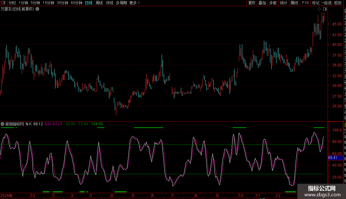 指标不仅提供KDJ和MACD的基础信号,其独特价值在于通过MACD的DIF线突破其DEA的长期波动通道(UP/DN)来捕捉潜在的趋势启动或极端转折点。绿色粗信号线出现的位置(顶部或底部)直观地提示了这些关键时机。