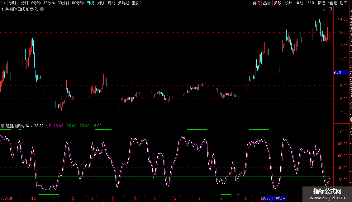 在坐标轴上绘制了Y1(25) 和Y2(75) 两条水平参考线,用于标识超卖和超买区域。