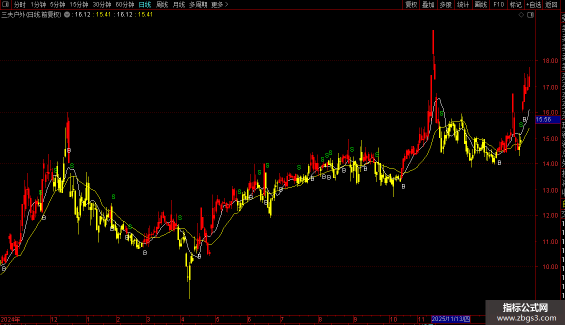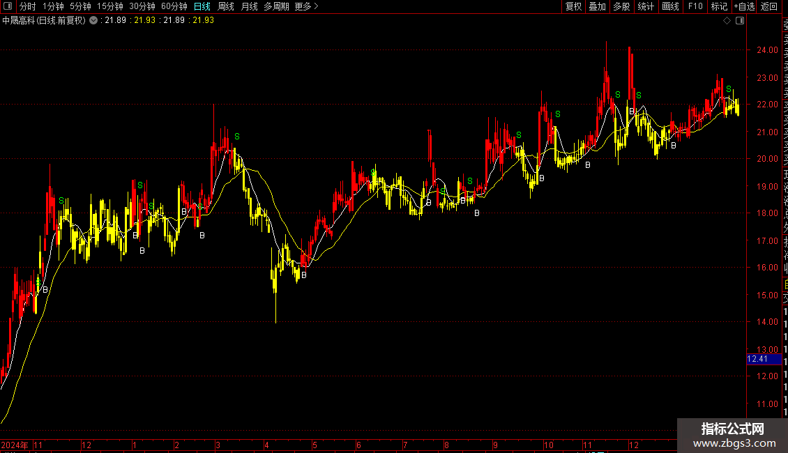 交易信号:关注K线柱颜色由空头色(白/黄)转为多头色(红)时,并伴随出现“B”买入信号;反之,当K线柱颜色由红转白/黄,并出现“S”卖出信号时,可考虑离场或做空。