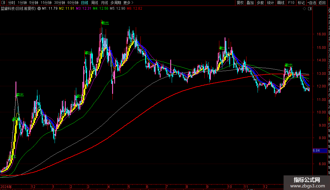 绘制一条关键的长期红色均线M6,它是VAR1(M3的55日EMA)的144日EMA。