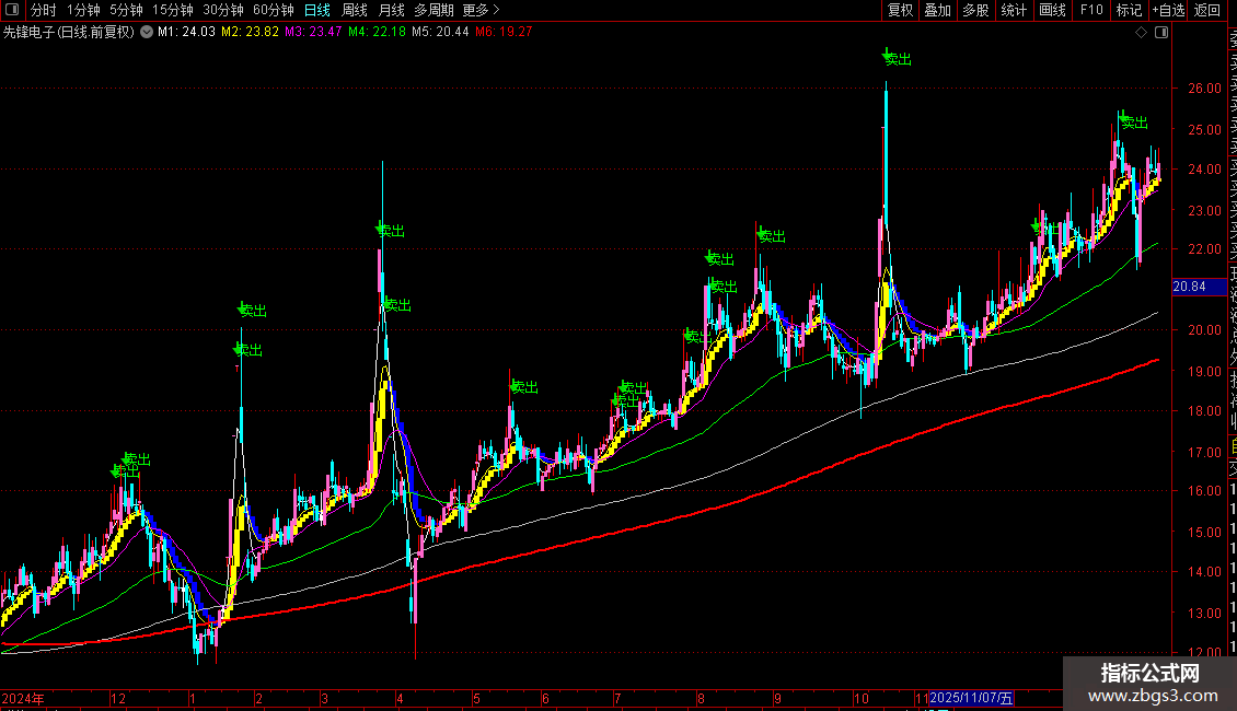通过柱状线(STICKLINE)直观显示该均线(A)与其前一日值(B)的对比:当前值大于前一日时显示黄色柱,小于时显示蓝色柱。
