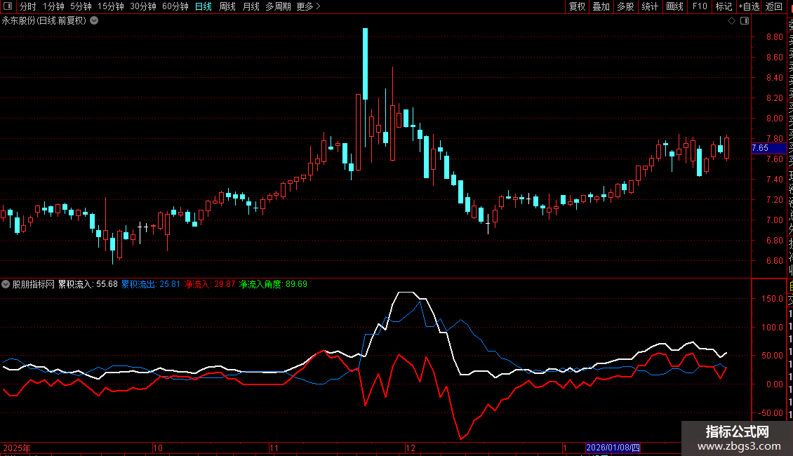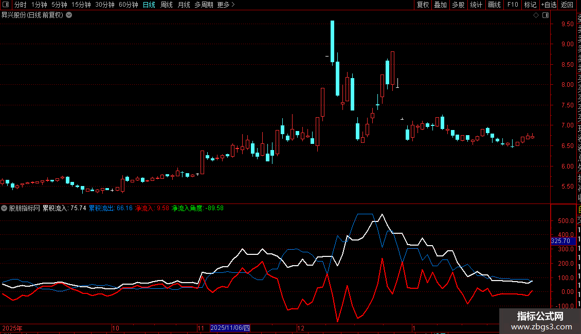 8. 净流入:计算“累积流入”与“累积流出”的差值,以蓝色粗线显示。