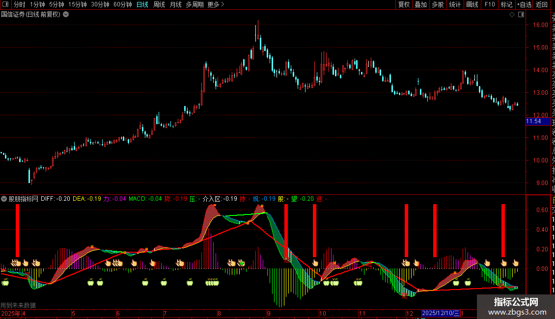 多条`STICKLINE`:根据上述规则,用不同颜色绘制`MACD`柱状图,以区分动能强弱变化。
