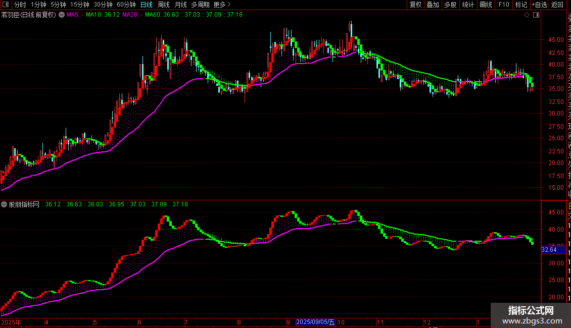 4. 对VAR7的显示规则是:如果当前预测值大于前一周期预测值,则以洋红色(COLORFF00FF)粗线(LINETHICK2)绘制;如果小于,则以绿色(COLOR00FF00)粗线绘制。这使其成为视觉上的核心参考线。