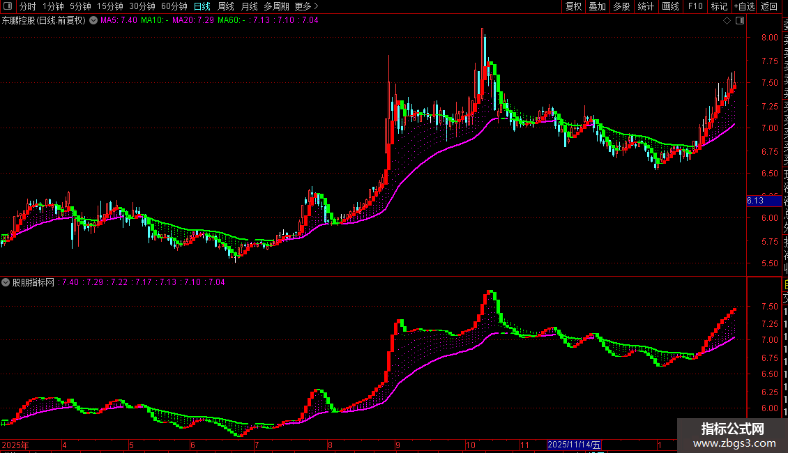指标通过多条复合均线的预测值及其颜色变化,来展示不同时间维度下价格的趋势方向(洋红色代表向上,绿色代表向下)。