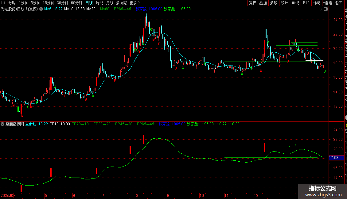 “生命线”和买卖信号“B/S”是动态变化的。实际使用时,“偏离线上10%抛”和“线下15%底”的具体百分比需用户自行计算或借助其他工具标注,指标本身未直接画出该百分比线。