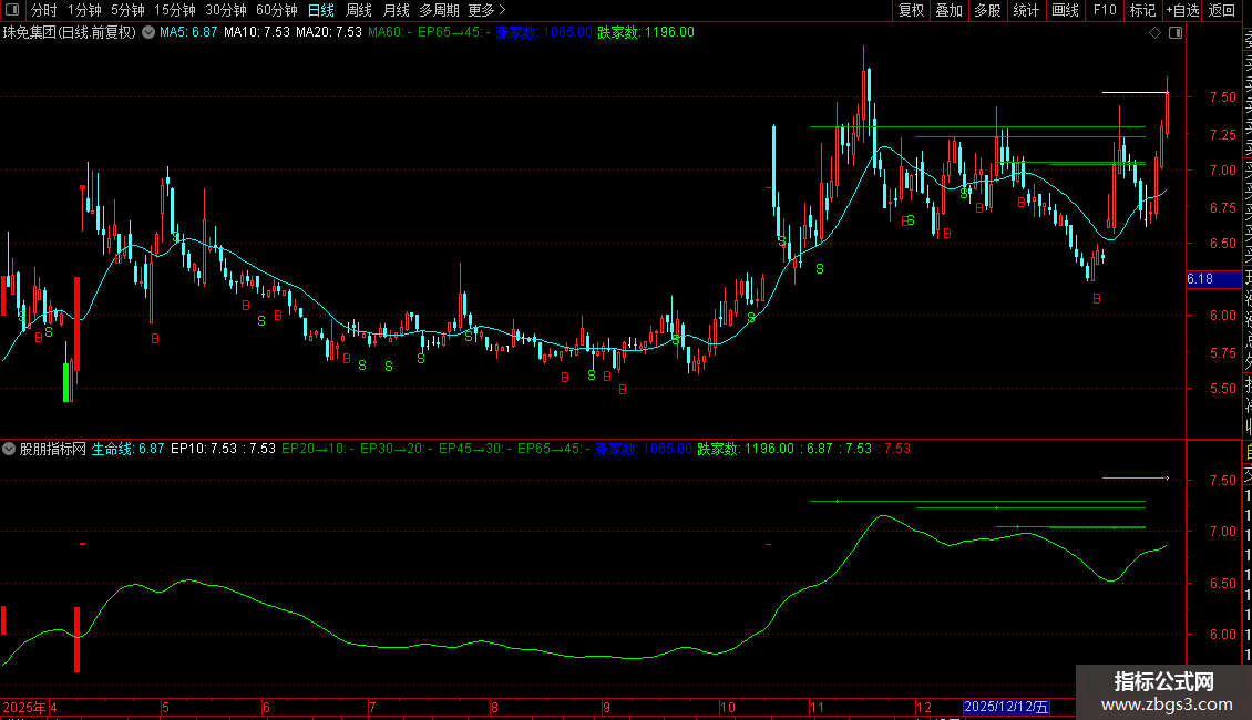 1. 核心趋势线(生命线):指标中名为“生命线”的青色曲线是核心趋势跟踪线。当股价运行于该线上方时,视为趋势偏多;下方则偏空。该线由经过复杂平滑处理的均价计算得出,旨在过滤噪音,反映股价内在趋势。