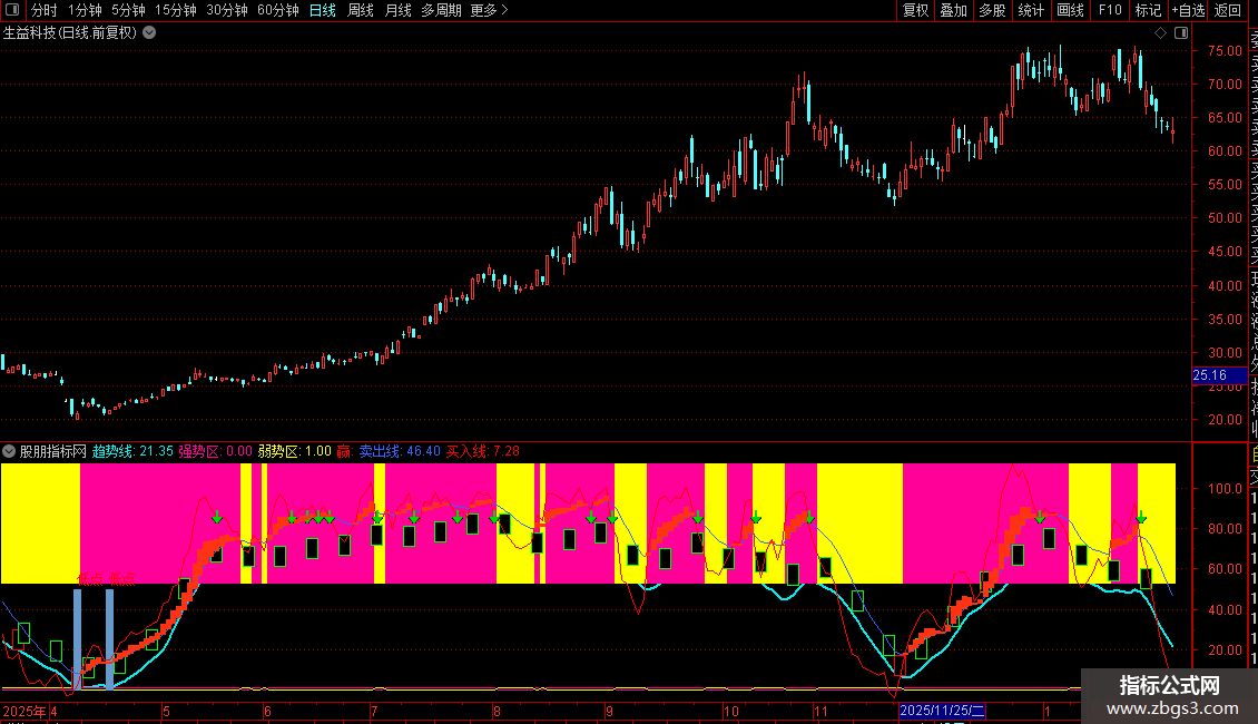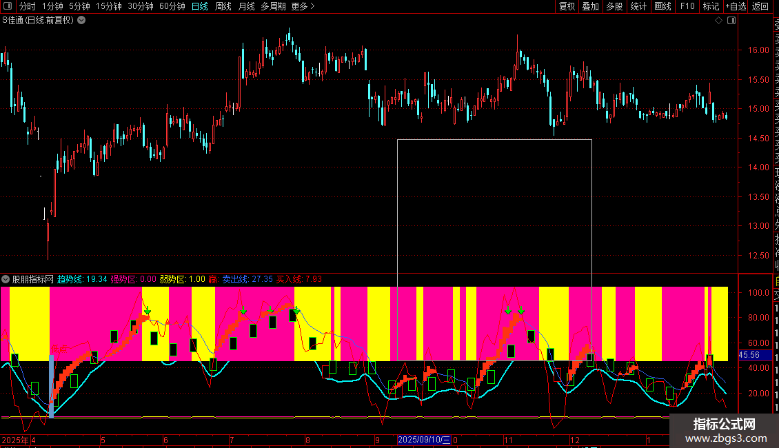 “强势区/弱势区”柱状带提供直观的多空背景。
