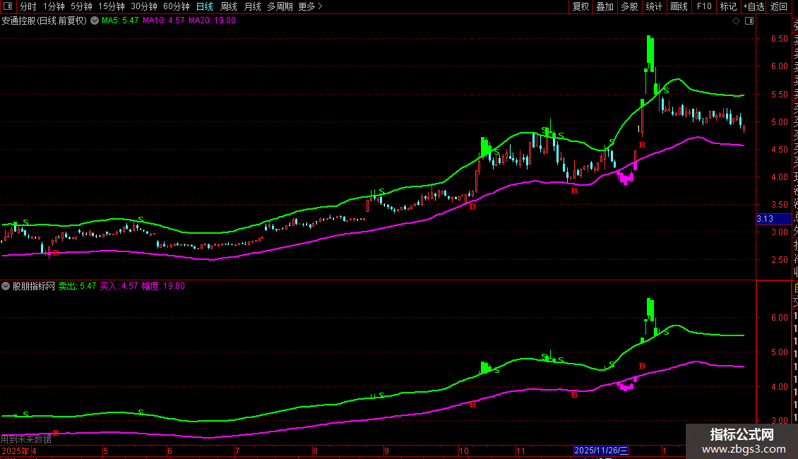 指标构建了一个由“买入线”和“卖出线”组成的通道。其核心视觉逻辑是,通过K线染色的变化,直观展示价格在通道内外的波动。当价格触及或突破下轨(买入线)时,可能产生买入信号(B);当价格触及或突破上轨(卖出线)时,可能产生卖出信号(S)。使用者可观察K线颜色变化与信号标记,结合通道宽度(幅度)来辅助判断市场状态和交易时机。