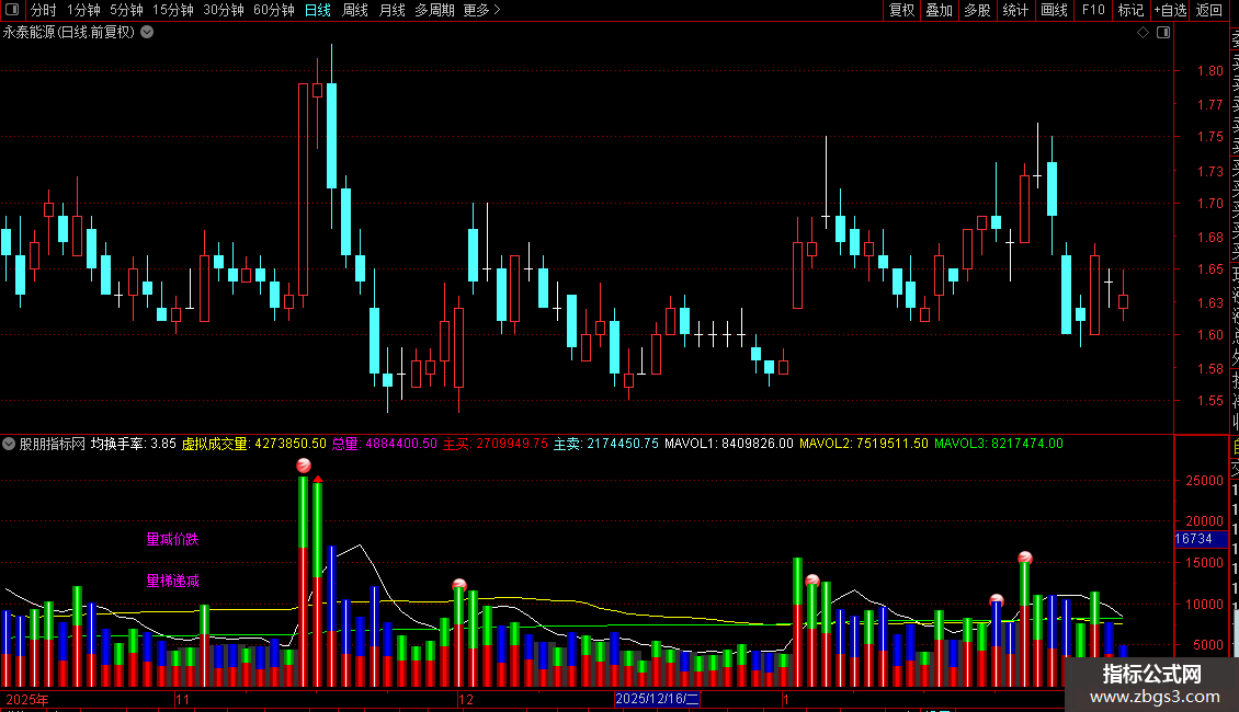 在副图区域上部,指标会根据当前成交量与价格的关系,用洋红色文字标注出不同的量价状态,例如“量增价升”、“量减价跌”、“量梯递增”等,用于辅助判断行情阶段。