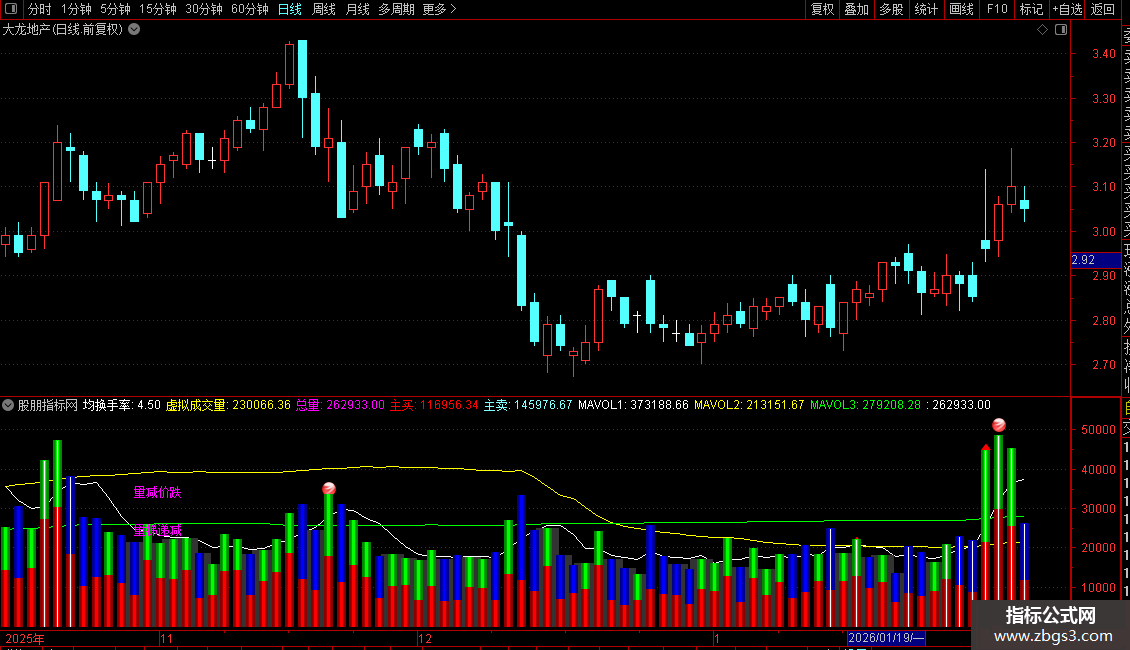 虚拟成交量:在当日分时图(最后一根K线)中,会用青色空心柱体预测显示全天的预估成交量。