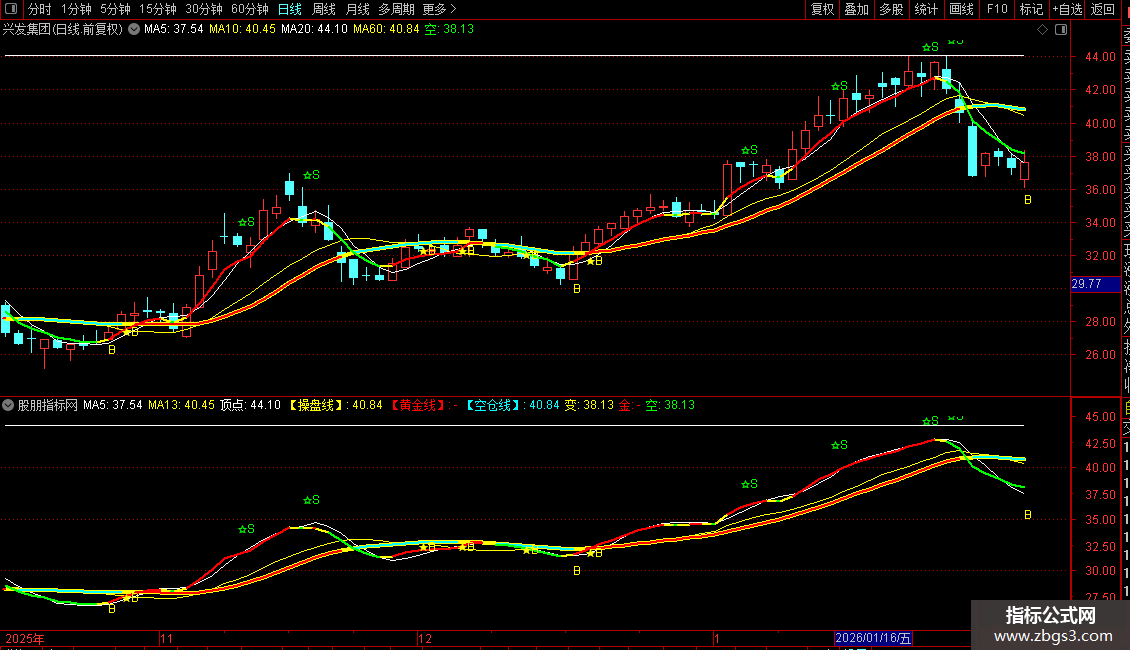 2. 计算一个加权“重心”价格。当“重心”位于“操盘线”之上时,“操盘线”显示为红色粗线(黄金线),视为持仓信号;反之则显示为青色粗线(空仓线),视为空仓信号。