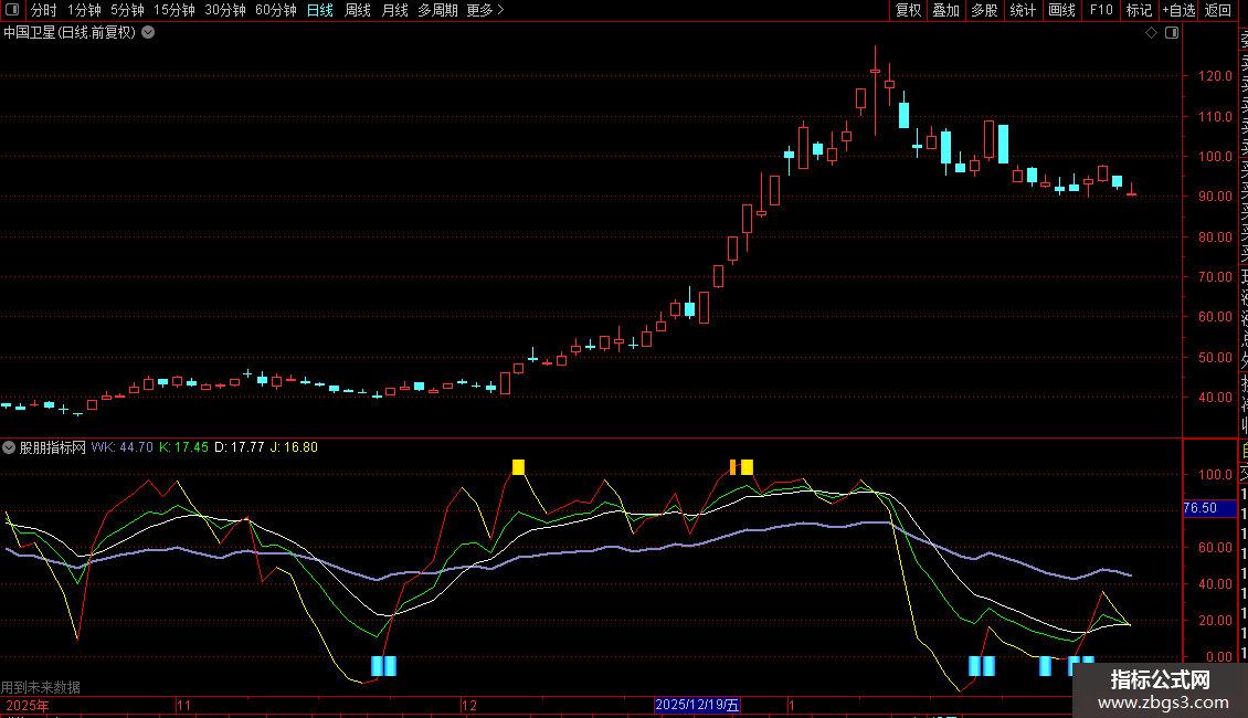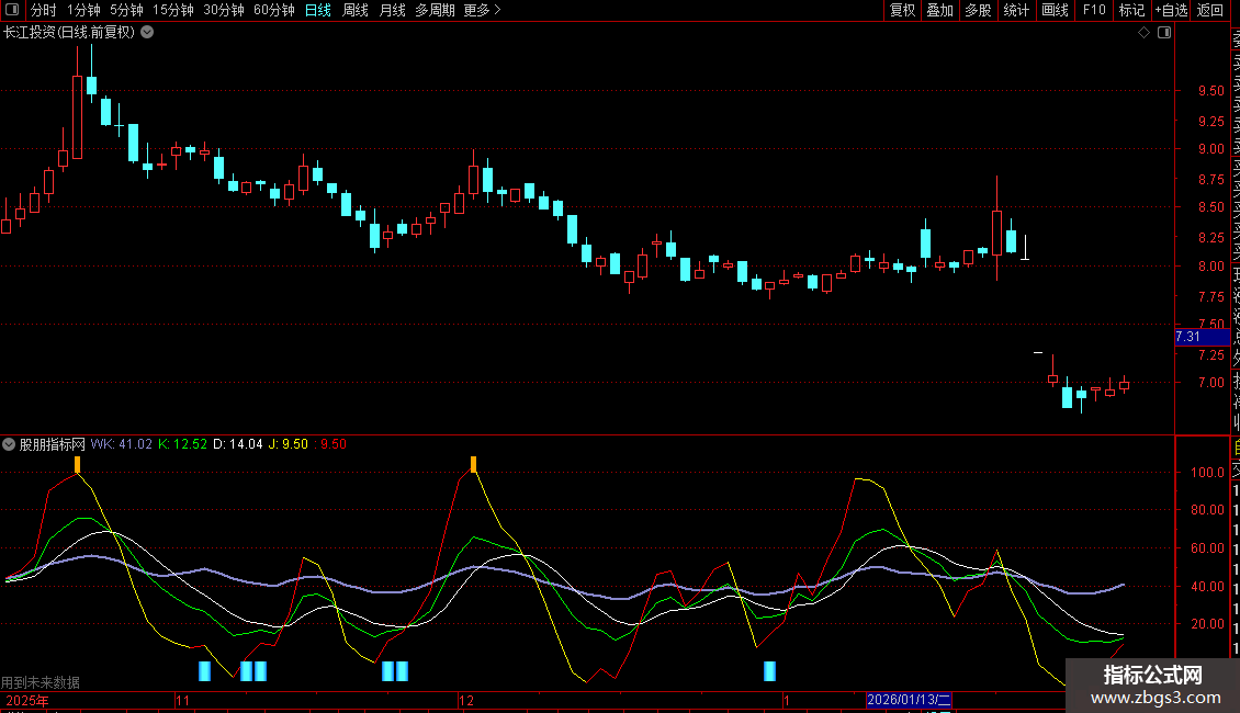 K、D、J线:标准随机指标(KDJ)。K线为快速线(绿色),D线为慢速线(白色),J线为方向敏感线(青色)。其计算周期为标准的(9,3,3)。