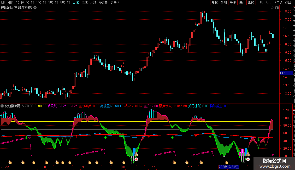 3、90以上的兰色和绿色柱是顶部提示,但出现兰色柱后,红色波段线在85以上,同时粘合k线持续上升,则可以持有,股价还有相当的上涨空间。