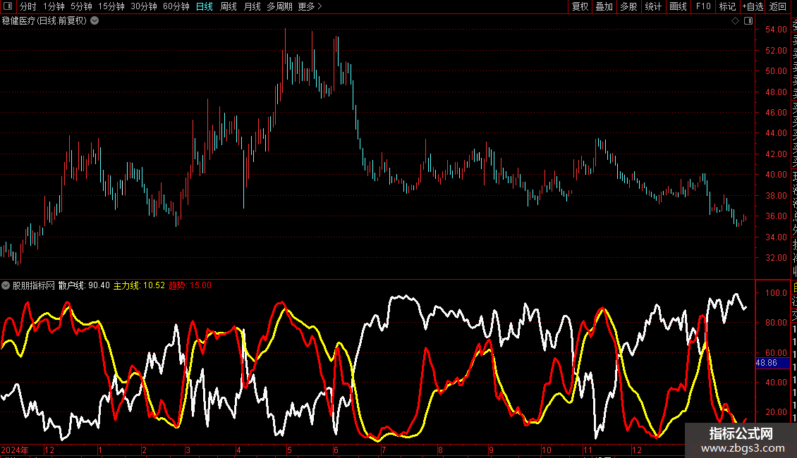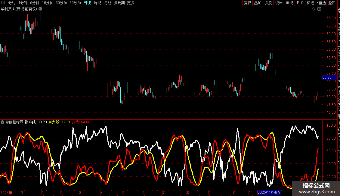 2. 主力线与散户线形成对比:主力线上穿散户线可能预示主力进场。