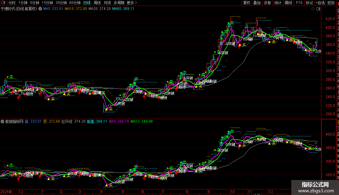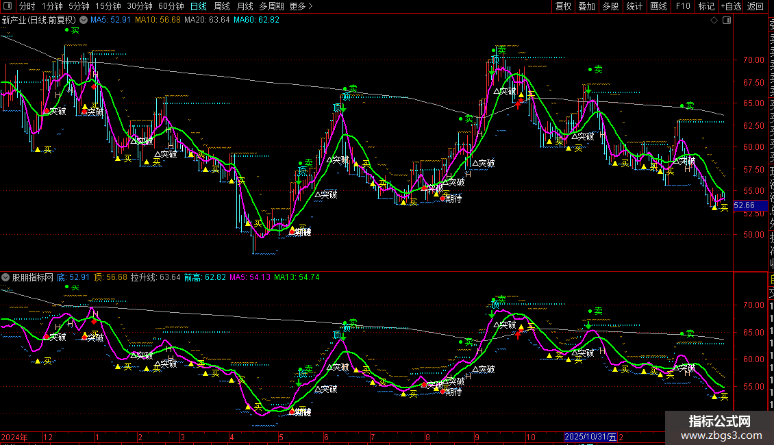 指标信号繁多,需结合整体趋势(如均线排列、前高压力)来过滤次要信号,优先关注“突破”、“回踩”、“买(★)”等关键信号。