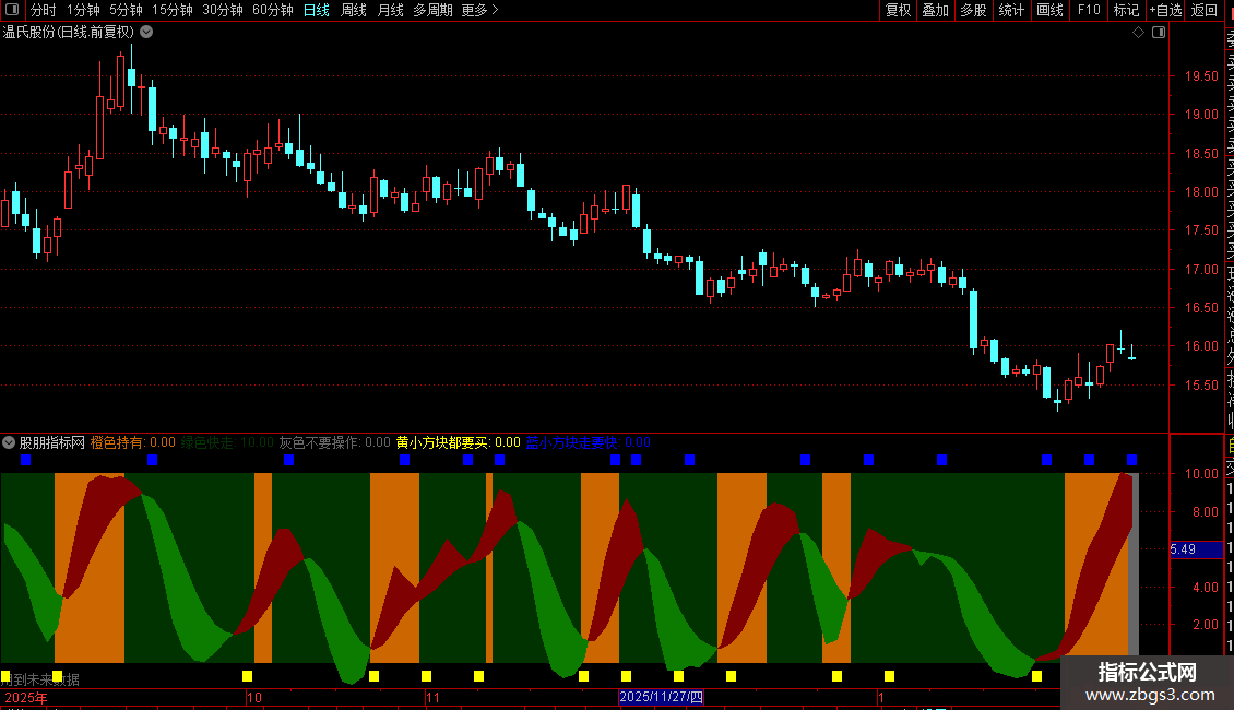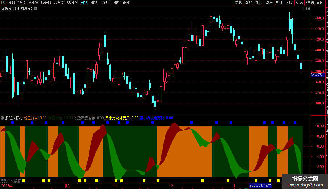 2. 等关键信号:在橙色持有区域,若出现底部黄色小方块,是加码或买入信号。在绿色快走区域或橙色区域末端,若出现顶部蓝色小方块,是必须执行的卖出信号。