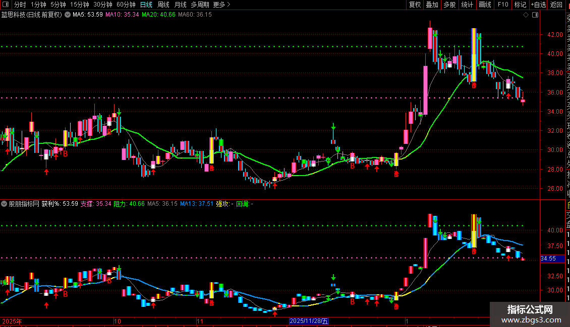 突破信号:当价格以特定方式突破均线系统时,在K线最低价下方标记一个“信号”图标。