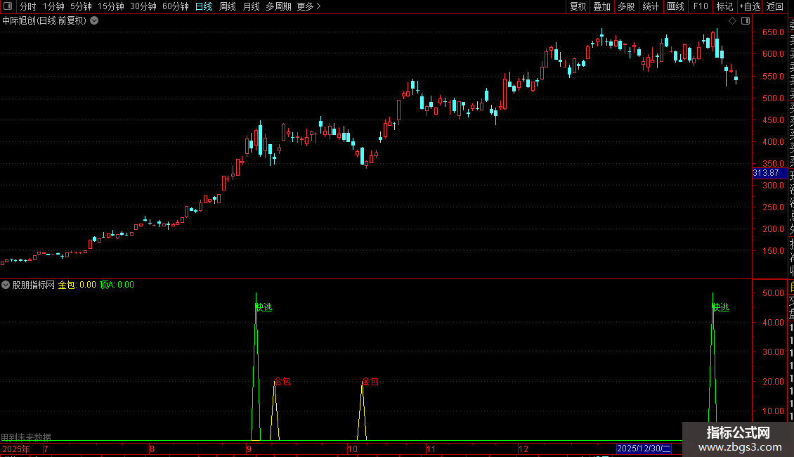 “快逃”信号:这是一个逃顶或反弹卖出提示信号。它试图识别价格在上涨后形成阶段性高点(波峰)的时机。当出现“快逃”文字提示时,表明公式认为可能出现了短期高点,提示风险。