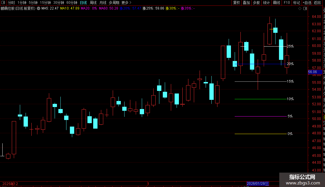 3. 根据股价波动,在达到相应涨幅位置时,绘制对应的水平线并标注涨幅百分比(如5%、10%等)。