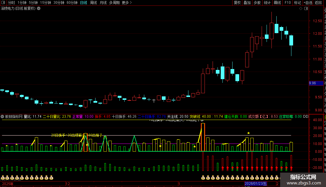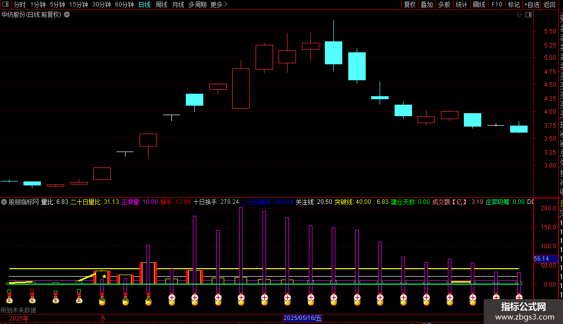 根据10日和20日累计换手率的高低,在副图下方显示不同图标作为提示信号。
