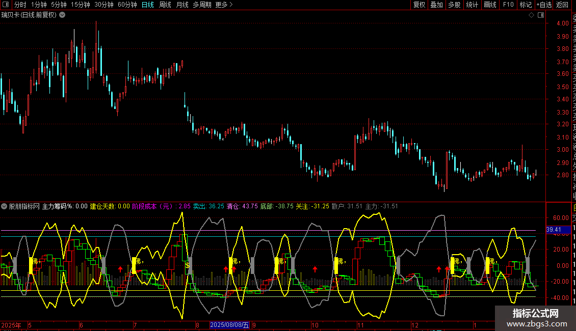 小心阴跌信号:当“散户”线上穿“主力”线时,视为卖出或风险信号,在图表上标记灰色柱。