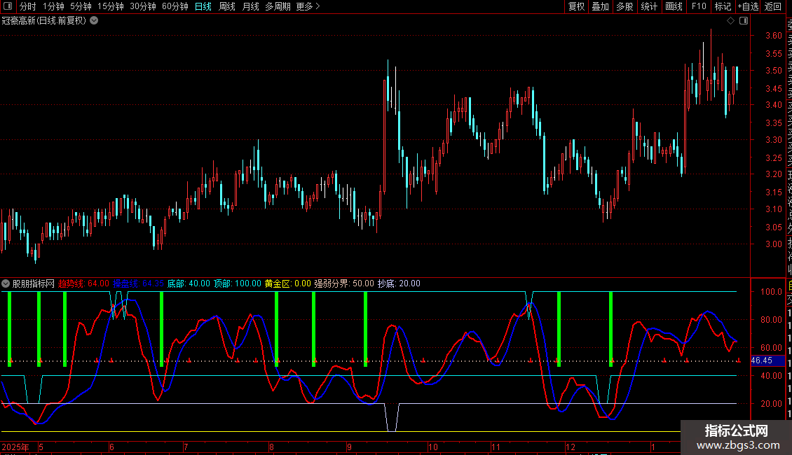 区域识别:利用`底部`、`顶部`标记以及`强弱分界`线(50线)来识别价格运行的可能极端位置和强弱状态。