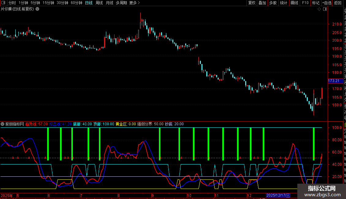 `操盘线`:通过复合计算价格在更长周期(27日)高低区间内的相对位置,并进行多重平滑处理得出。作为辅助趋势判断和交易信号线。
