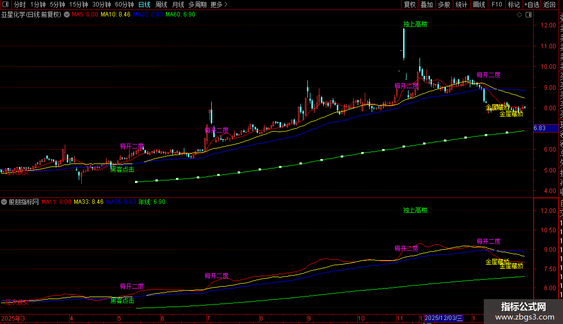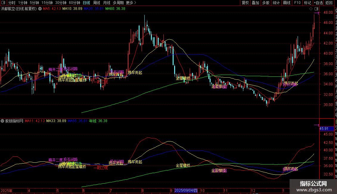 SJ3:=CROSS(MA(CLOSE,11),MA(CLOSE,55));{11线上穿55线}