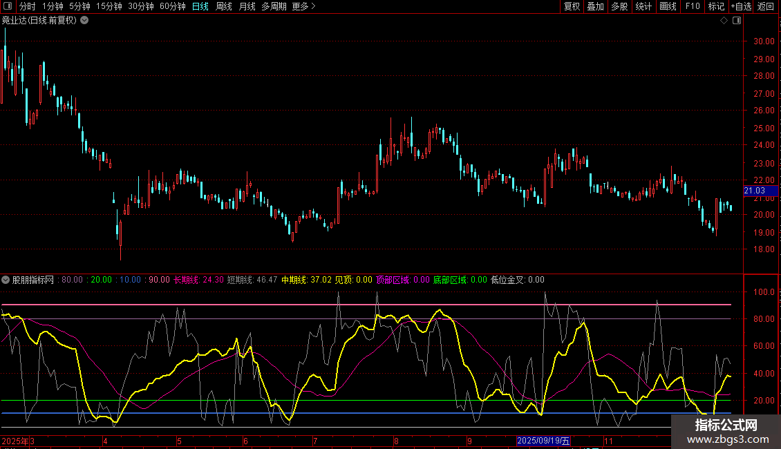 顶部区域:(中期线<REF(中期线,1) AND REF(中期线,1)>80) AND (REF(短期线,1)>95 OR REF(短期线,2)>95 ) AND 长期线>60 AND 短期线<83.5
