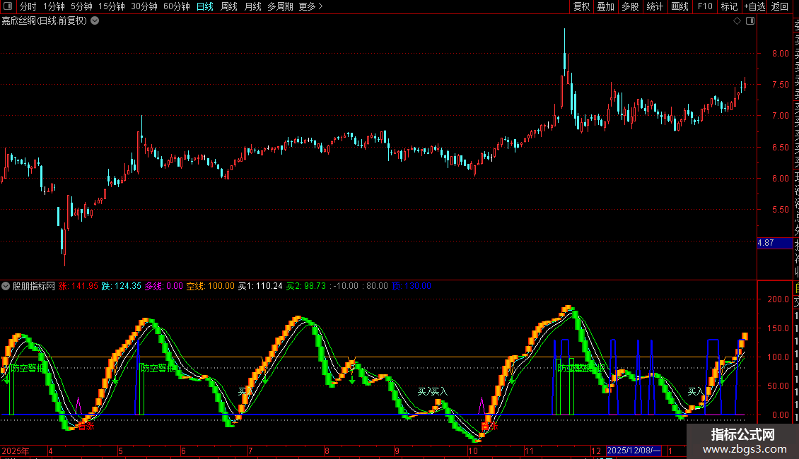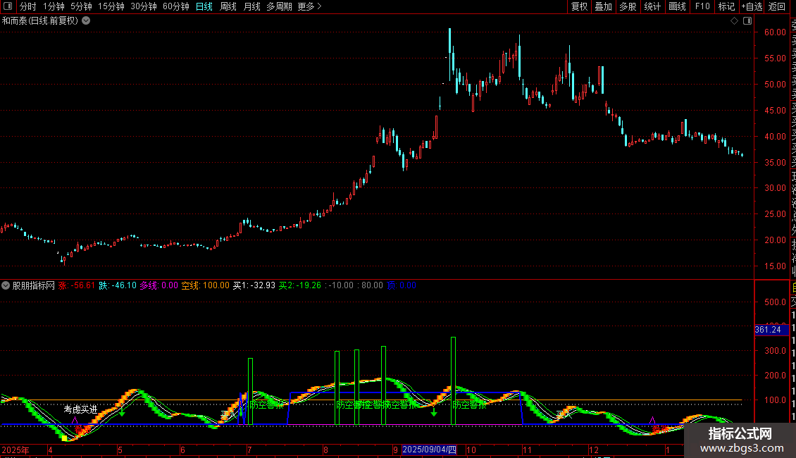 空线:IF(CROSS(跌,80),70,100),COLOR0099FF,LINETHICK1;