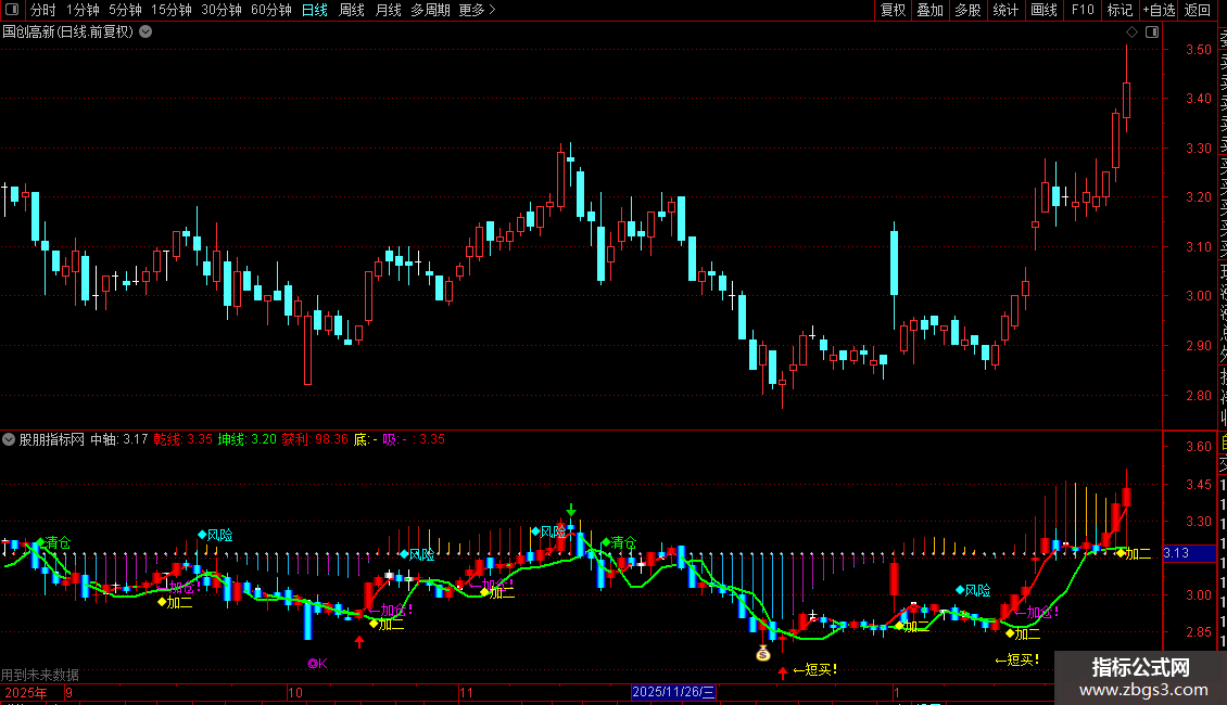 DRAWTEXT(CROSS(MA(C,3),MA(C,9)) AND C>=REF(C,1) AND C>O,L*1.00,'←加仓!'),COLORMAGENTA;