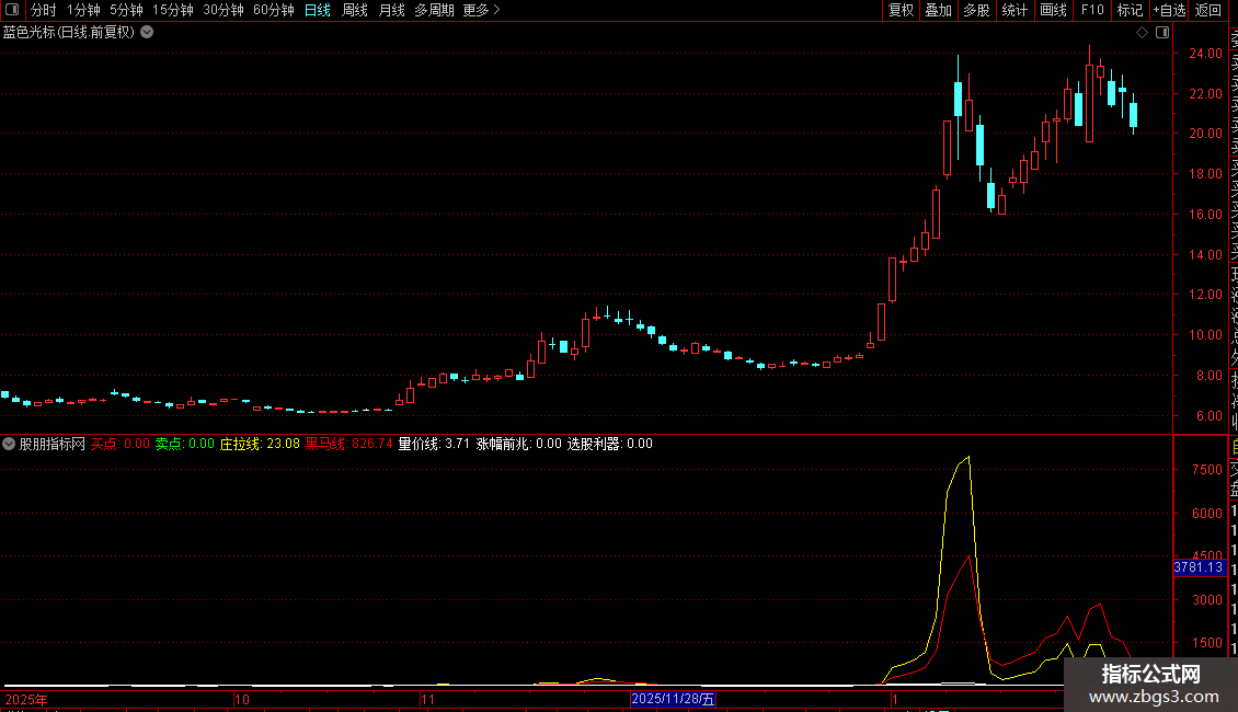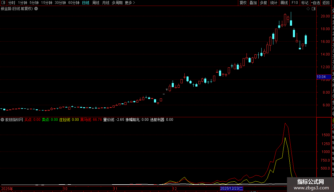 黑马线: IF( VAR28>0.1,VAR29,0)*5, COLORRED;