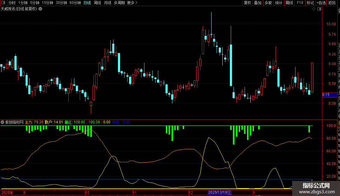 该指标适合中长线,出现红色柱子买入的信号比较少,有选股公式
