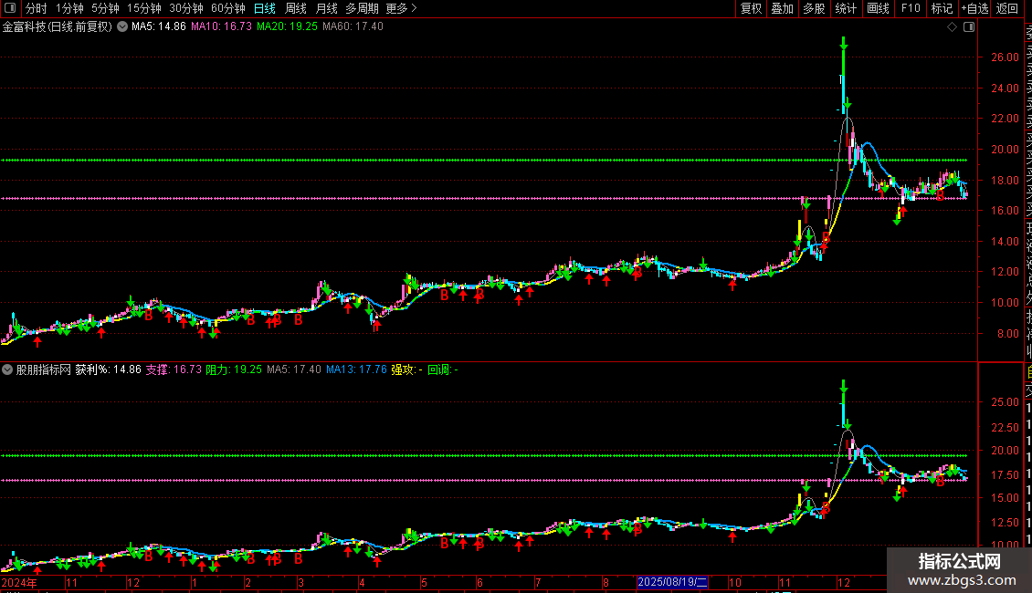 回调:IF(MA3<REF(MA3,1) AND MA3>0,MA13,DRAWNULL),COLORGREEN,LINETHICK2;